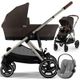 - W ramach zestawu otrzymujesz siedziska spacerowe, każde montowane w obu kierunkach jazdy, z pałąkiem, podnóżkiem i bardzo szeroką budką przeciwsłoneczną.